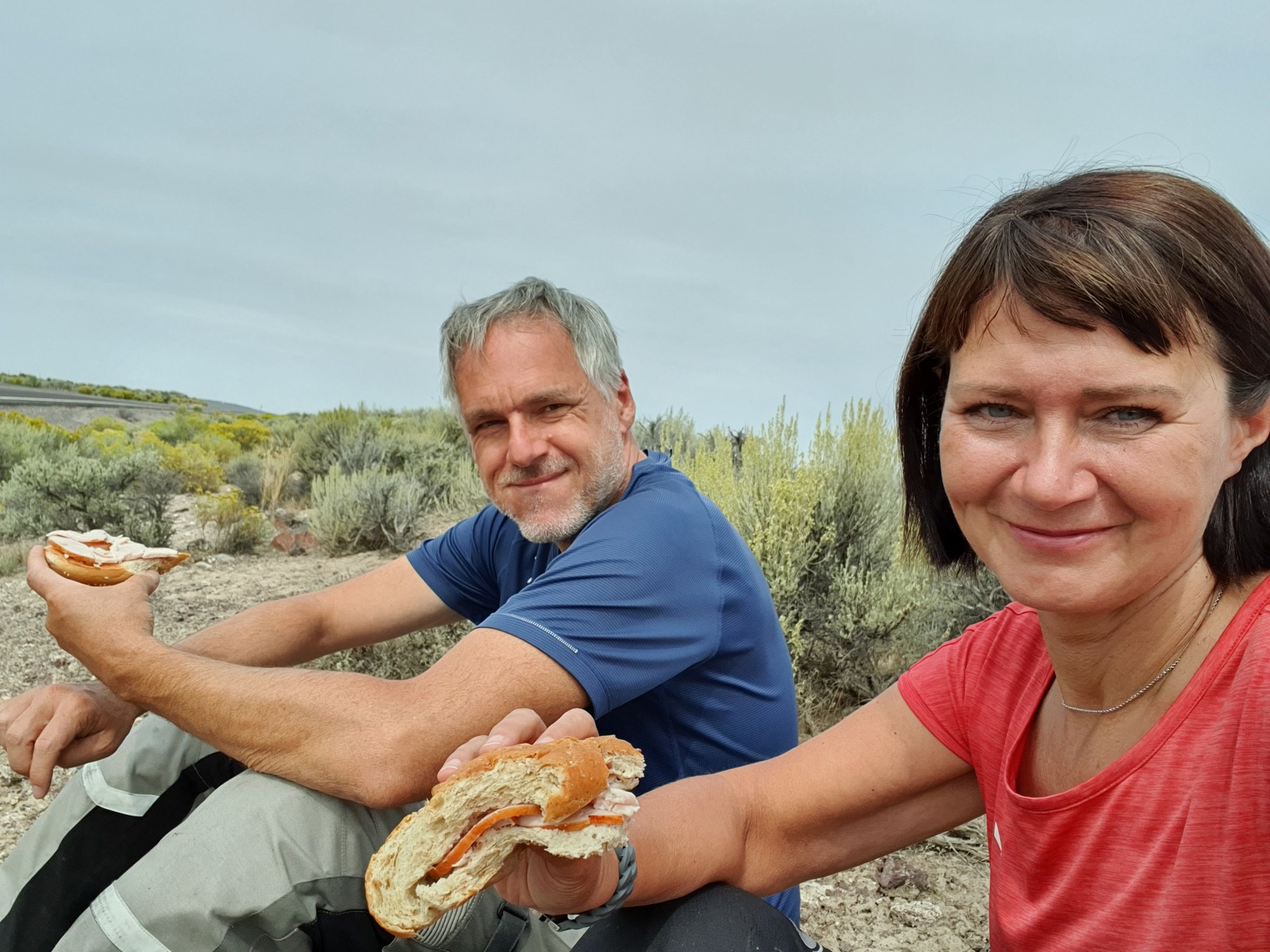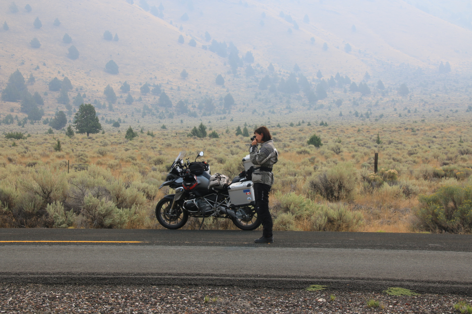 Nach Lakeview gibt es ein Hinweisschild: Oregon Outback. Und ab da begann das „Ödland“ wie Hannes es nennt. Knapp 200km dauert die Fahrt durchs Outback. Die Landschaft ist ungefähr so abwechslungsreich wie der Blick auf den Tankrucksack. Büsche, Sand und Steine in schöner Regelmäßigkeit.