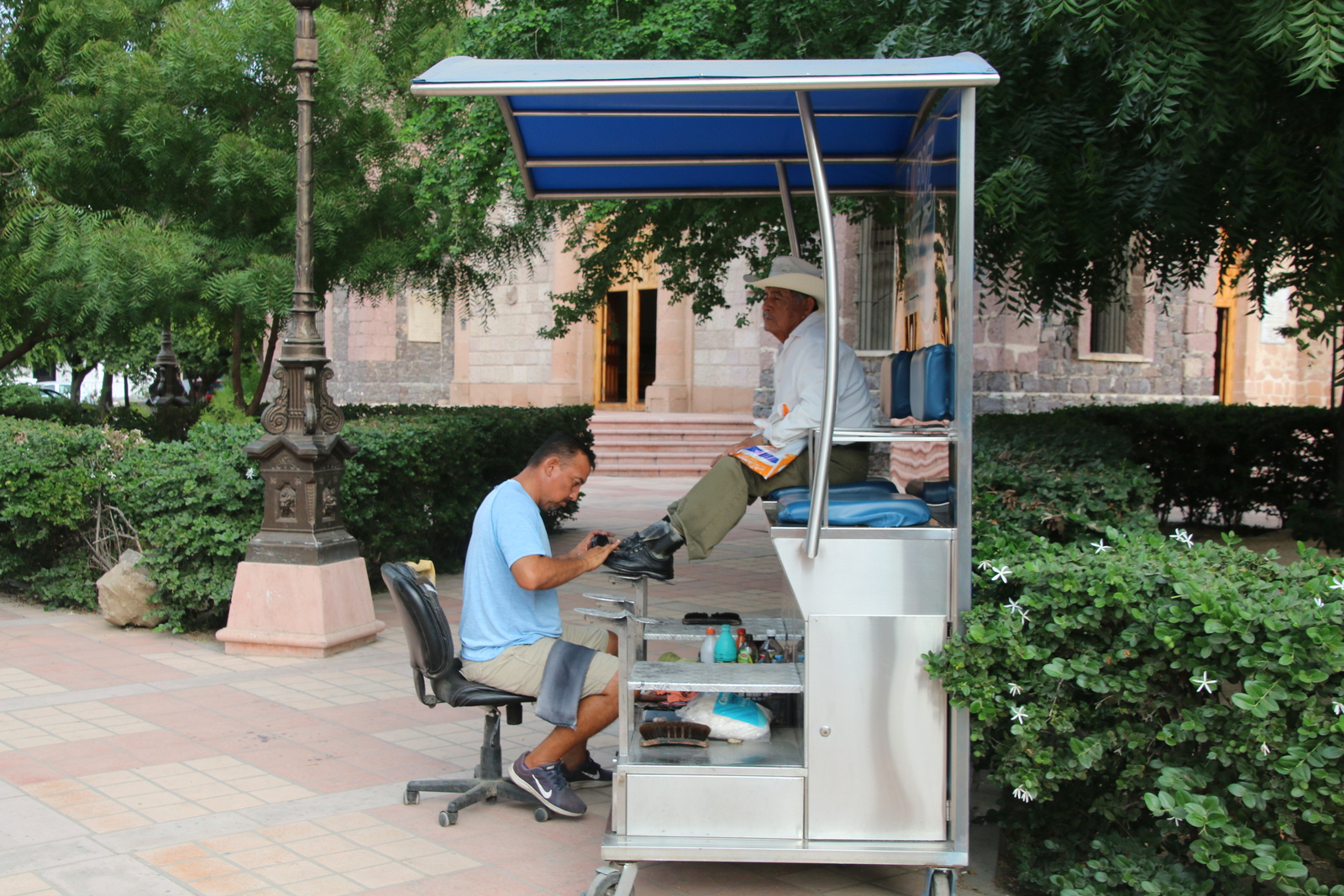 Wir starten zur ersten Runde durch die Stadt und sehen wir zum ersten Mal in Mexiko einen Schuhputzer. In den kleineren Orten hat es dieses Service nie gegeben. Unsere Stiefel könnten eine Reinigung sehr gut vertragen. Statt schwarz sind sie, seit wir auf der Baja sind, eher Sandgrau.