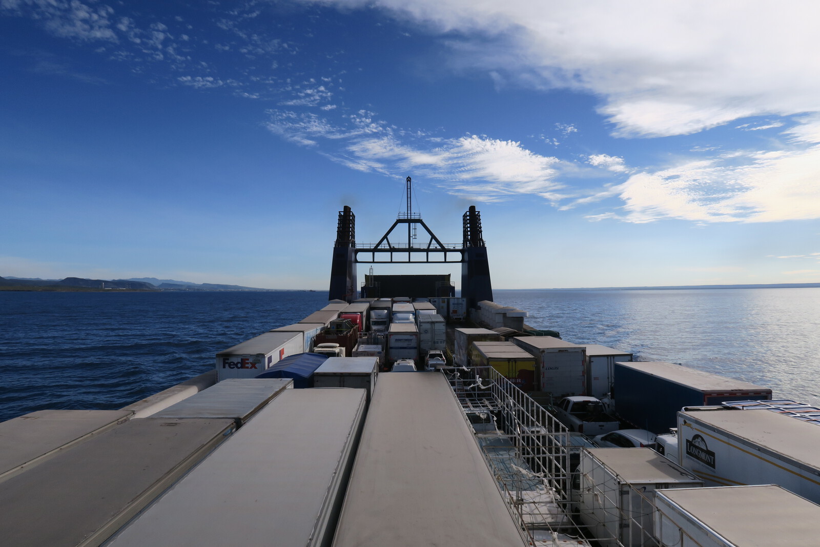Endlich dürfen wir aufs Schiff. Wir müssen rasch unsere Motorräder verzurren. Neben uns werden die letzten LKW Anhänger eingeparkt. Als Hannes fertig ist, muss er schon unter einem Anhänger durchkriechen. Sonst gibt es keinen Weg mehr raus. Das Einparken der LKW-Anhänger wird vom Fährpersonal sehr routiniert und millimetergenau durchgeführt. Zwischen den Anhängern ist kein Platz zum Durchgehen, so knapp wird geschlichtet.