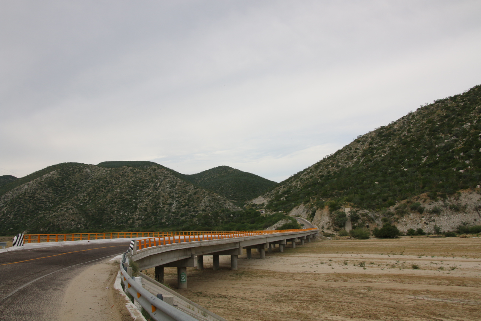 Auch hier ist die Wüste momentan grün. Obwohl auf ein paar Bäumen schon wieder die ersten Blätter verwelken und gelb werden. Weil wir genug Zeit haben, machen wir den kurzen Abstecher zur Ensenada de los Muertes. Das hat sich aber überhaupt nicht ausgezahlt. Die Bucht ist nicht besonders schön. Wir folgen einer kleinen befestigten Straße, aber kurz vor dem Meer ist sie mit einem Schranken und einem Wärter abgeriegelt. Er erklärt uns, dass es hier zu einem Privathaus geht und dass wir ohne Einladung nicht weiterdürfen. Wäre interessant wer hier wohnt.