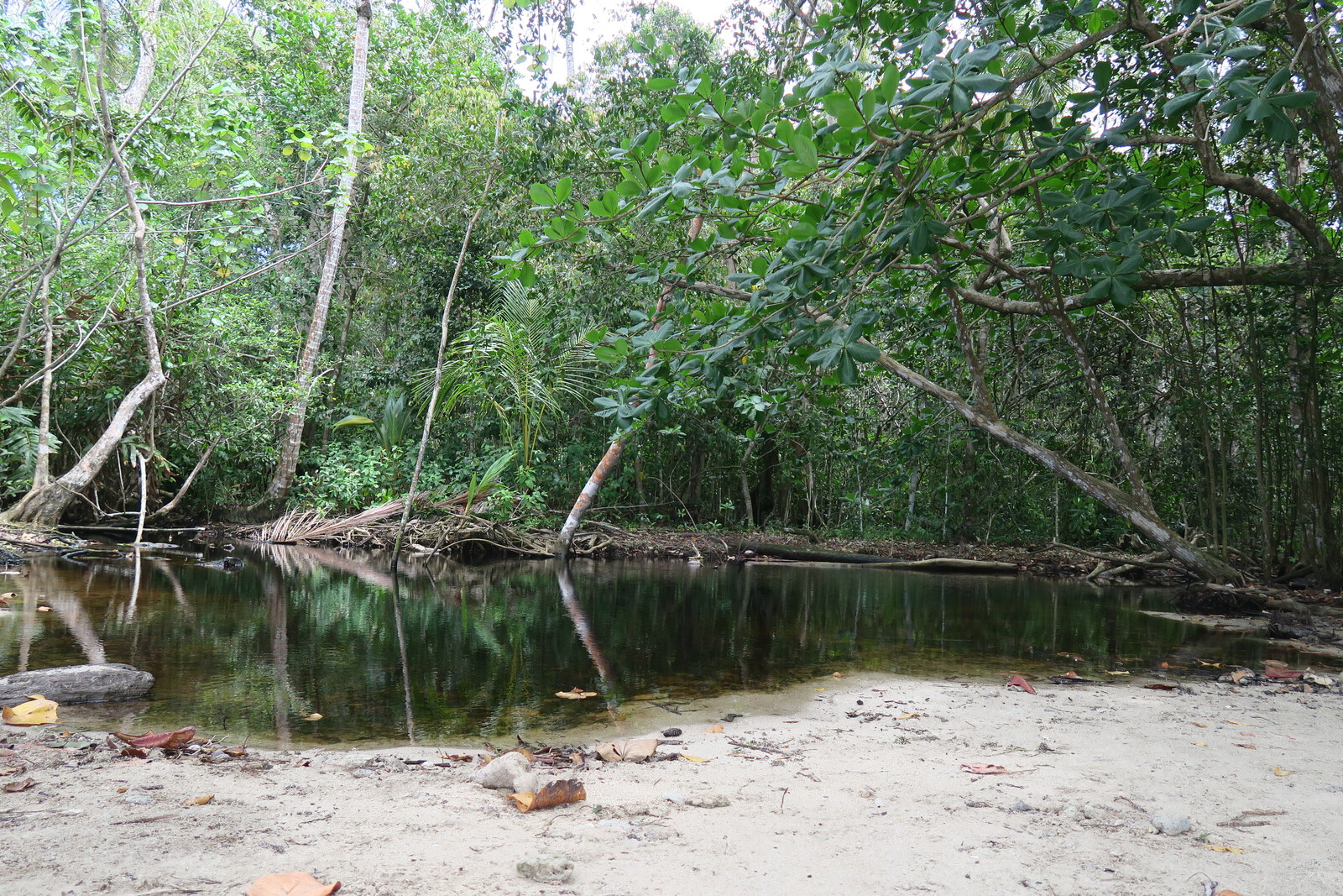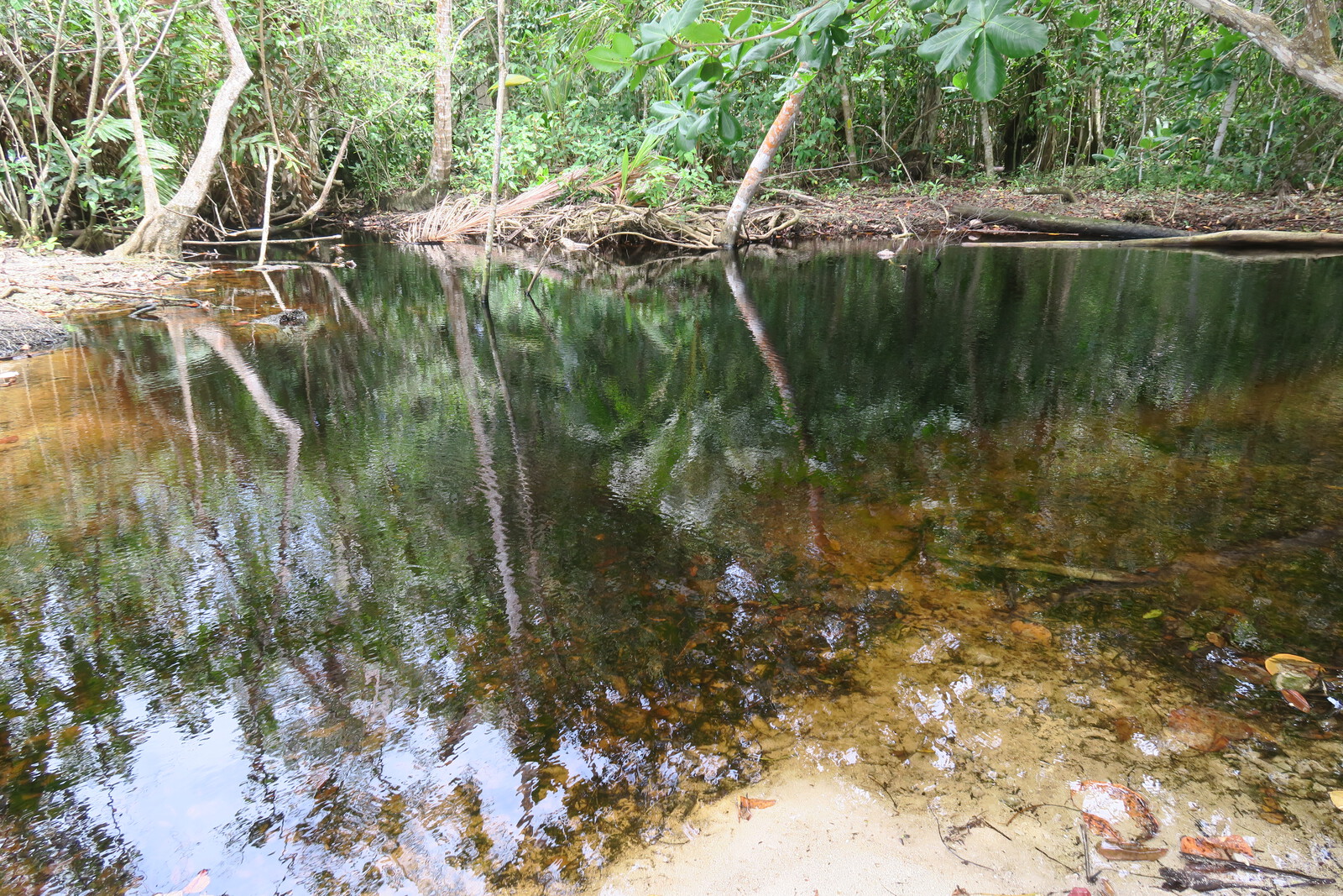 Laut Information ist hier im Nationalpark schon 60m an Küstenlinie verlorengegangen. Das Wasser unterspült die Pflanzen am Ufer und viele Palmen liegen schon kaputt am Boden.