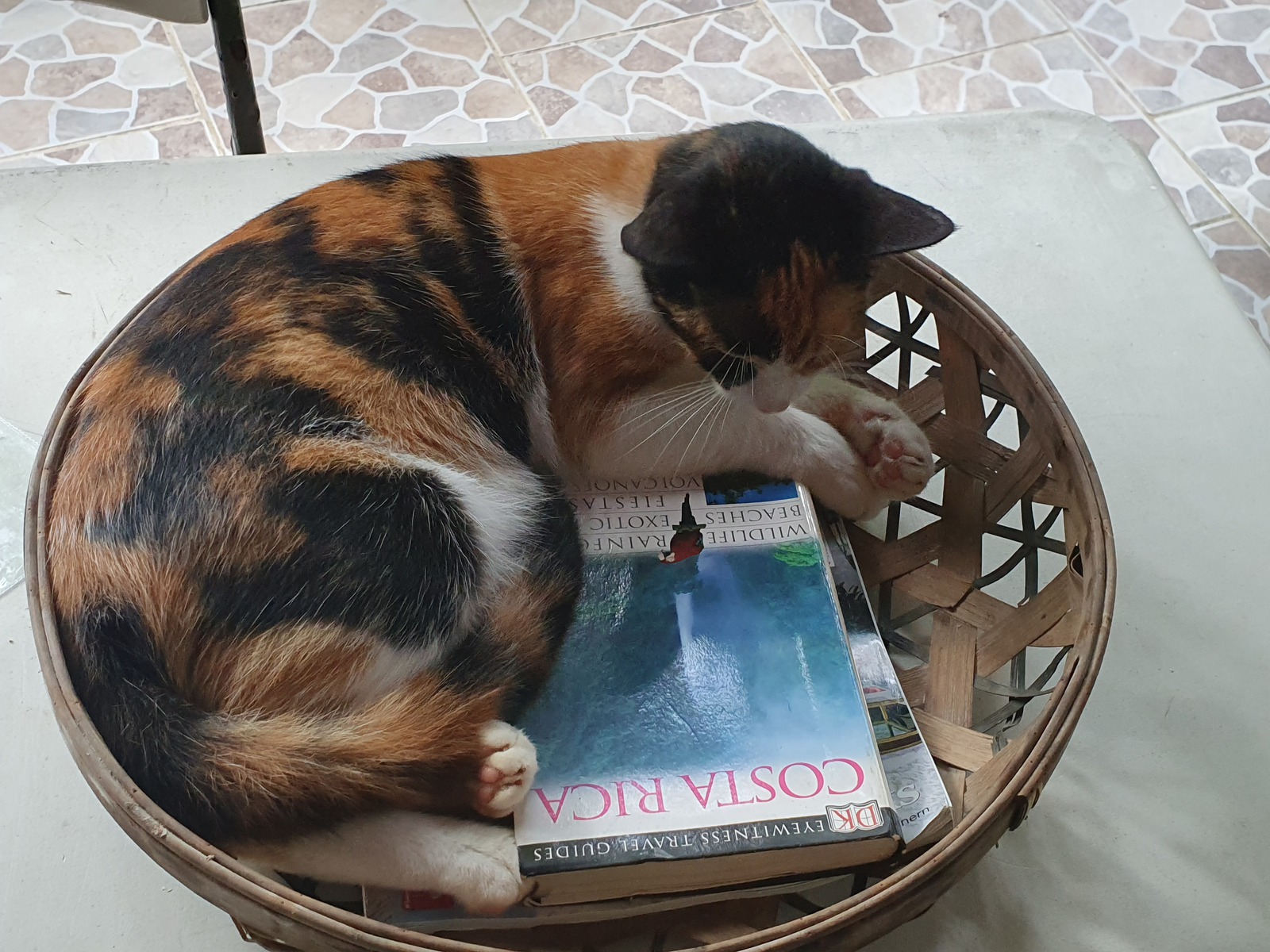 Wir frühstücken noch nbichts ahnend und sehen eine der Katzen, wie sie ganz niedlich und unschuldig in einem Körbchen zusammengerollt auf einem Reiseführer schläft.